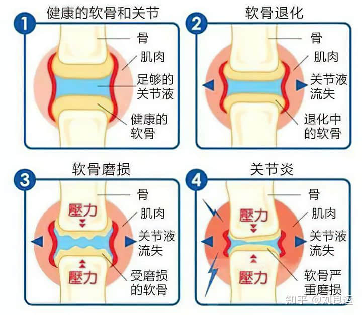③疼痛加剧关节破坏。因为疼痛而减少活动量,一方面会影响关节的营养供给,加速退变和炎性因子的累积,另一方面导致关节周围肌肉、韧带松弛,关节稳定性下降,活动时关节更容易发生损伤。结果就是,疼痛会加重关节损伤,损伤会进一步加重疼痛,陷入恶性循环。