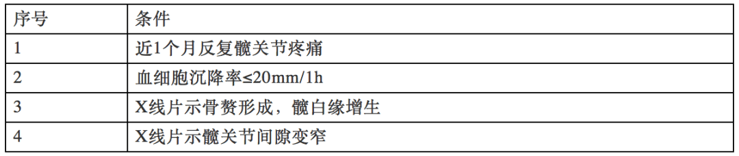 2.X线片(站立或负重位)示关节间隙变窄、软骨下骨硬化、和(或)囊性变、关节缘骨赘形成。
