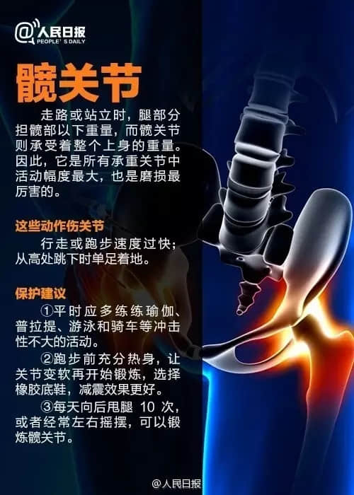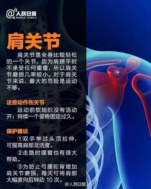 而人体这几个地方关节最容易受伤,今天,送您最简单的关节保养方法,看过一次,一辈子都受益! 以上就是人民日报关于这几个关节的保护建议,都可以学习下哦。 当然,关节出现问题也不用怕,尽快到骨科医院拍片检查才是上策,切勿听信偏方等以免贻误治疗时机,早检查早治疗,身体健康方能民盛国强。